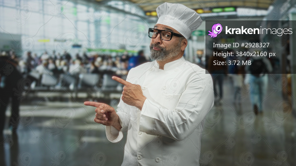 Man chef in white uniform and hat points both index fingers to the side in busy airport terminal; playful travel.