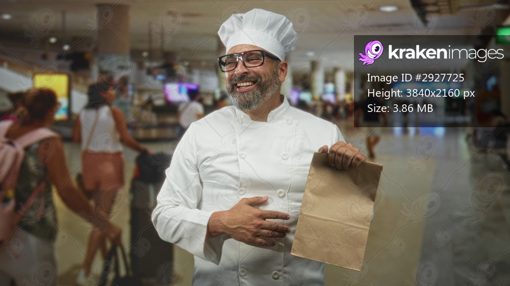 Man chef in white uniform holding a paper bag and laughing with hand over eye in airport; joy travel humor.