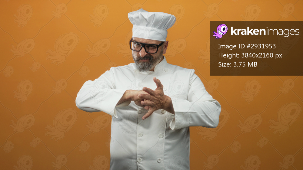 Man chef in white uniform and toque with clenched hands and folded arms in studio with orange wall; determination grit.