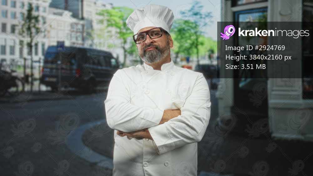 Man chef in white uniform with toque and glasses, arms crossed on street; confidence professionalism craft.