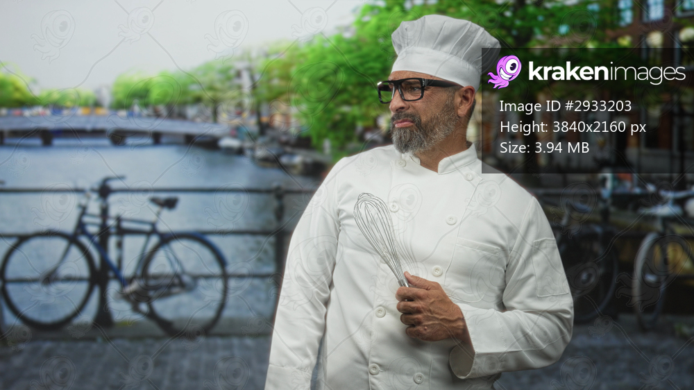 Man chef in white uniform and toque holding a whisk on a canal street by bicycles and water in amsterdam; confidence culinary craft.