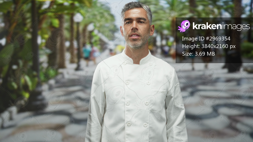 Man chef presenting open palm and pointing hand on a palm tree lined street while wearing a white chef coat; welcoming hospitality.