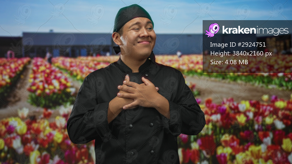 Man chef smiling and clasping hands over chest wearing black chef uniform and headscarf in a tulip field; gratitude nature connection.