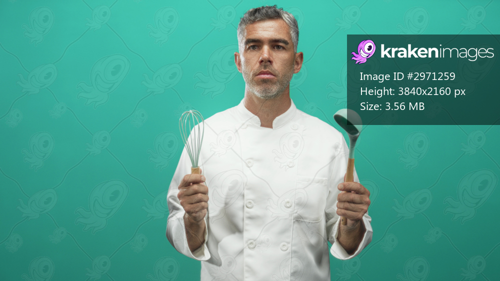 Man chef standing waist up in white buttoned chefcoat holding whisk and ladle with hands visible in studio; calm focus.
