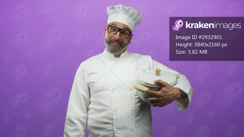 Man chef wearing white coat and tall hat, holding a white cooking pot with hands and smiling while looking at pot in studio purple; playful.