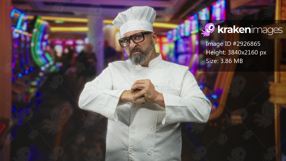 Man chef wearing white uniform and toque adjusts wrist with both hands beside slot machines in casino building; determination grit.
