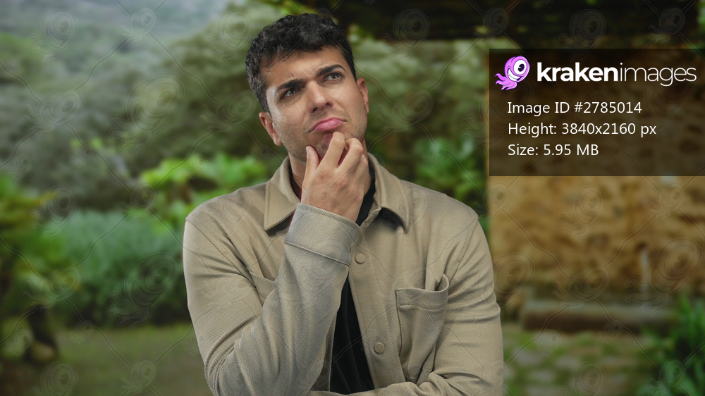 Man, chin touching, poses outdoors in a young hispanic pensive thinking guy portrait.