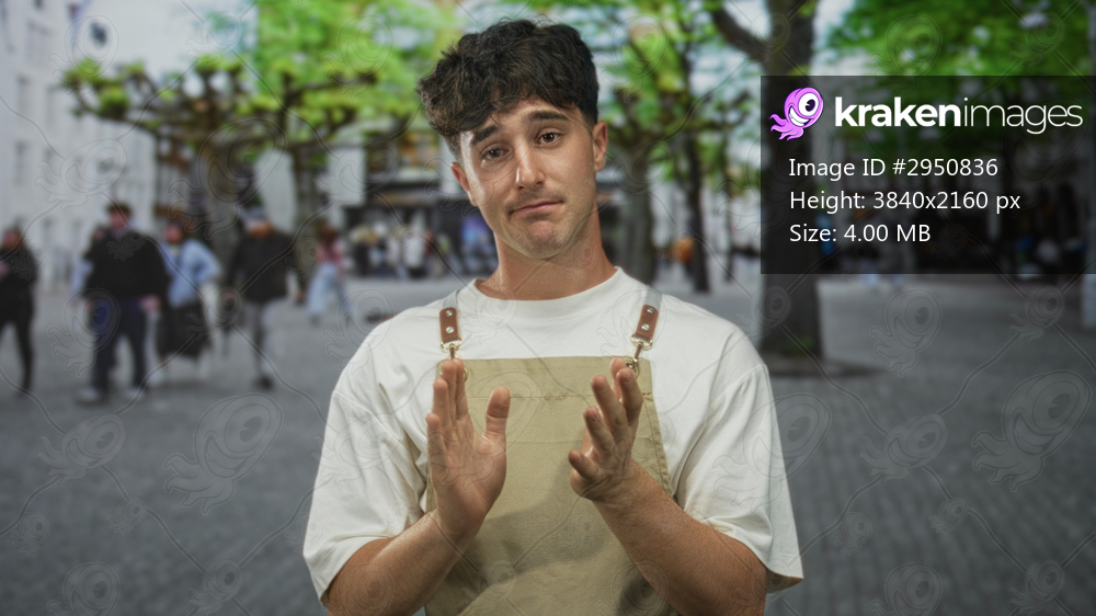 Man clapping hands in a busy city street plaza wearing beige apron and white tee with a slight embarrassed smile near trees and passersby; apologetic hesitation. - Kraken Images