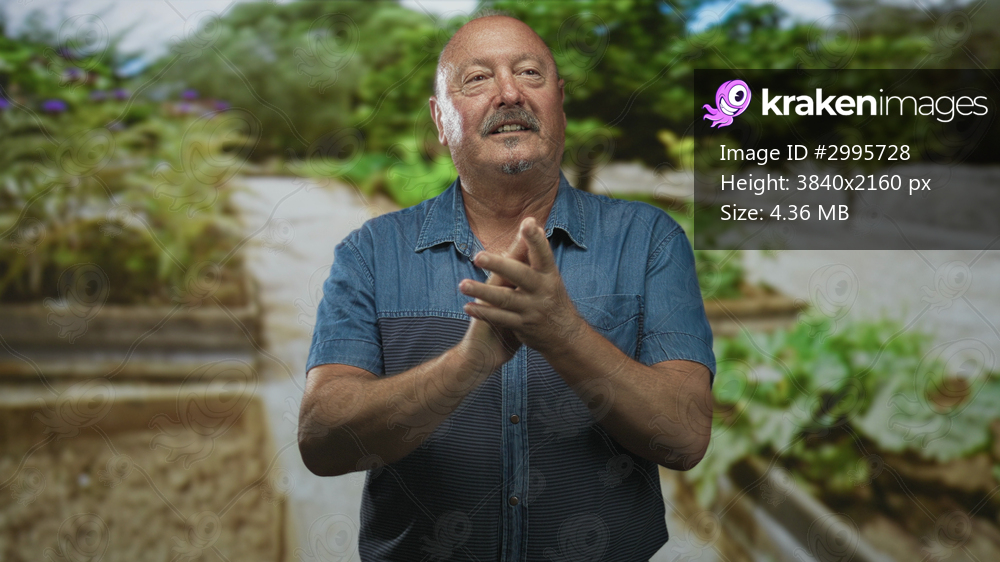 Man clapping hands in a studio in front of raised garden beds and pathway, wearing denim shirt and smiling; contentment gratitude.