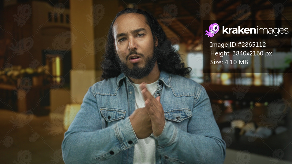 Man clapping hands in building restaurant interior with denim jacket and focused expression; confidence persuasion sincerity.