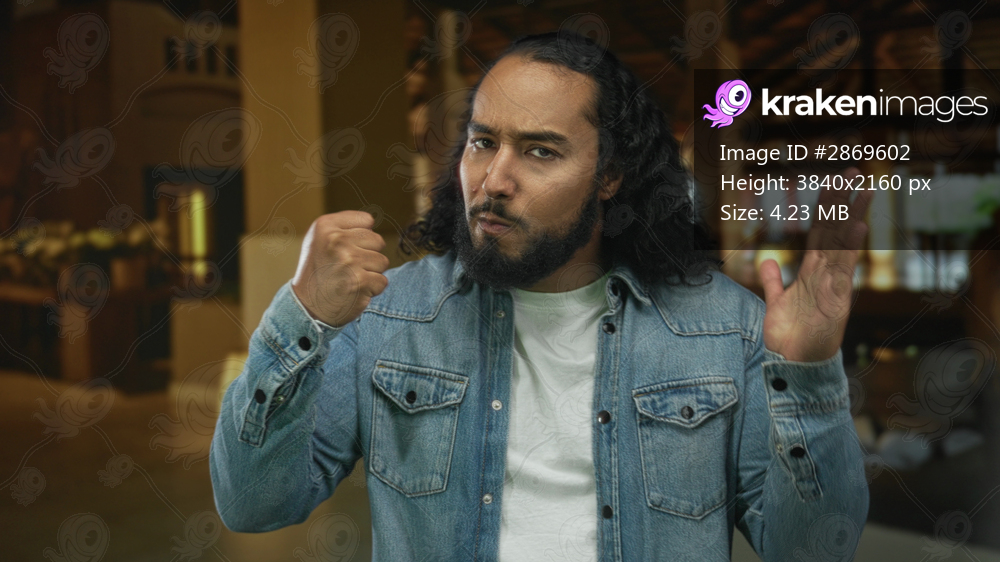 Man clapping hands in building restaurant interior with denim jacket and focused expression; confidence persuasion sincerity.