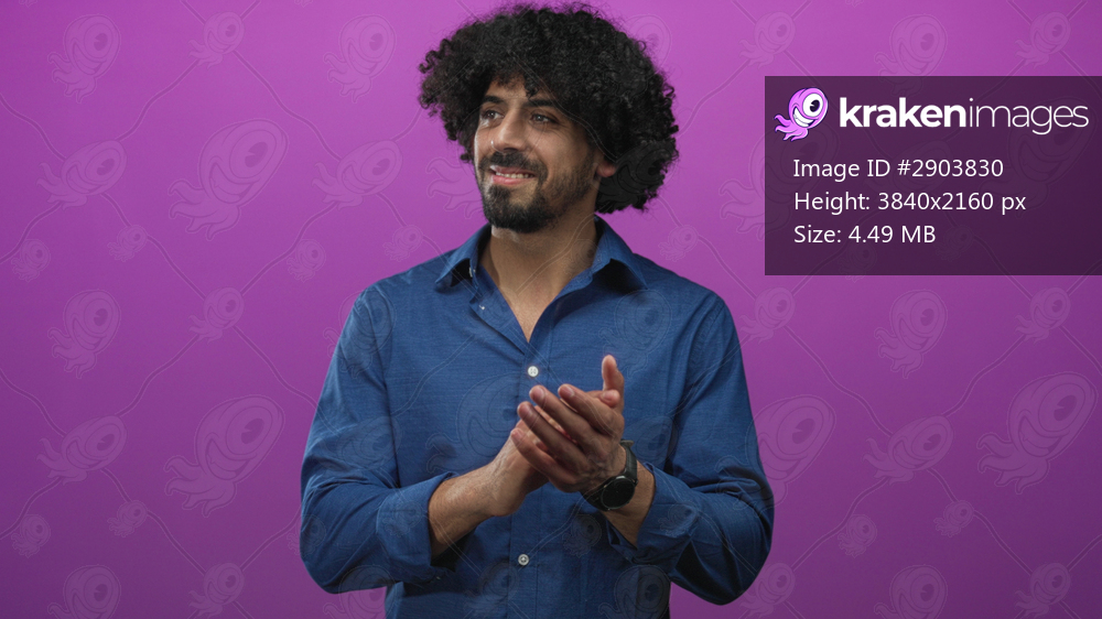 Man clapping hands in studio against a purple backdrop wearing a blue shirt and curly hair visible; applause celebration.