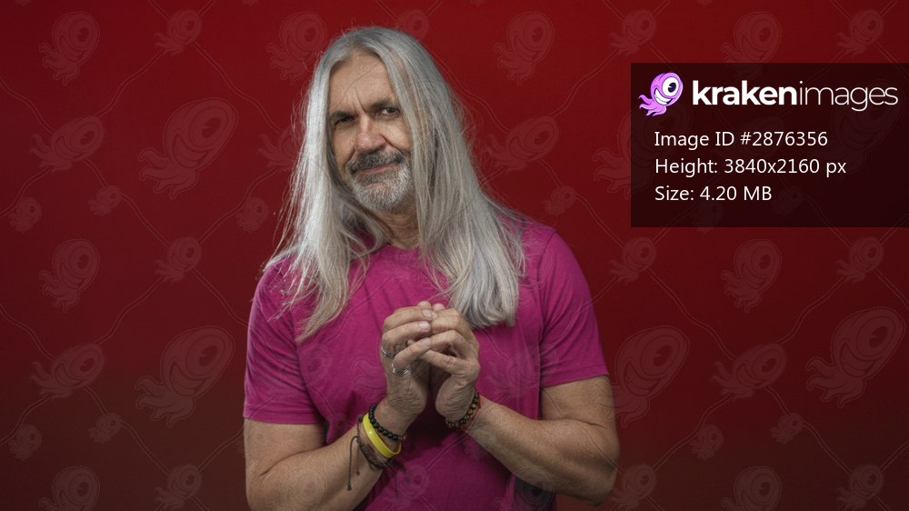 Man clapping hands with long silver hair, wearing pink shirt and bracelets in a red studio setting; quiet gratitude.
