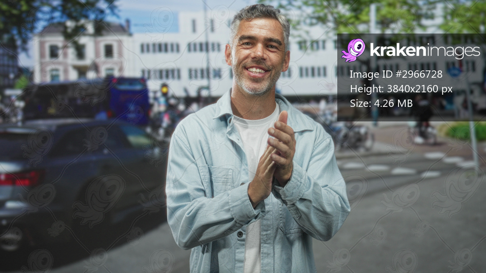 Man clapping hands on a busy street beside parked car and cyclists, middle age grey hair wearing light jacket with closed eyes in mid gesture; contentment. - Kraken Images