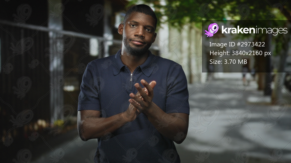 Man clapping hands on a sunlit street wearing a navy polo shirt, palms together mid applause and slight smile; calm appreciation.