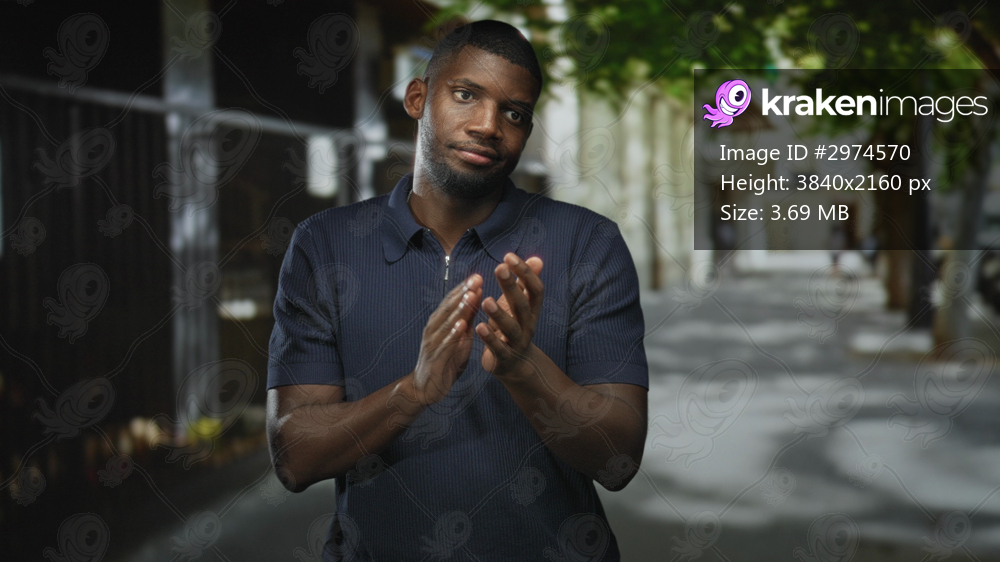 Man clapping hands on a sunlit street wearing a navy polo shirt, palms together mid applause and slight smile; calm appreciation.