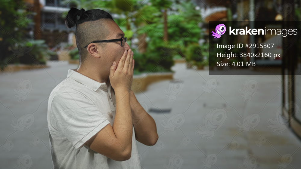Man clapping hands on city street plaza near shops wearing white polo and glasses smiling; welcome celebration joy.