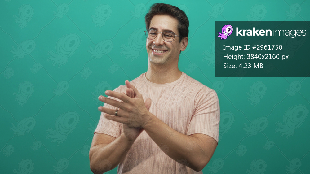 Man clapping hands and smiling in a studio green backdrop, wearing glasses and a pink shirt with a ring; celebration approval.