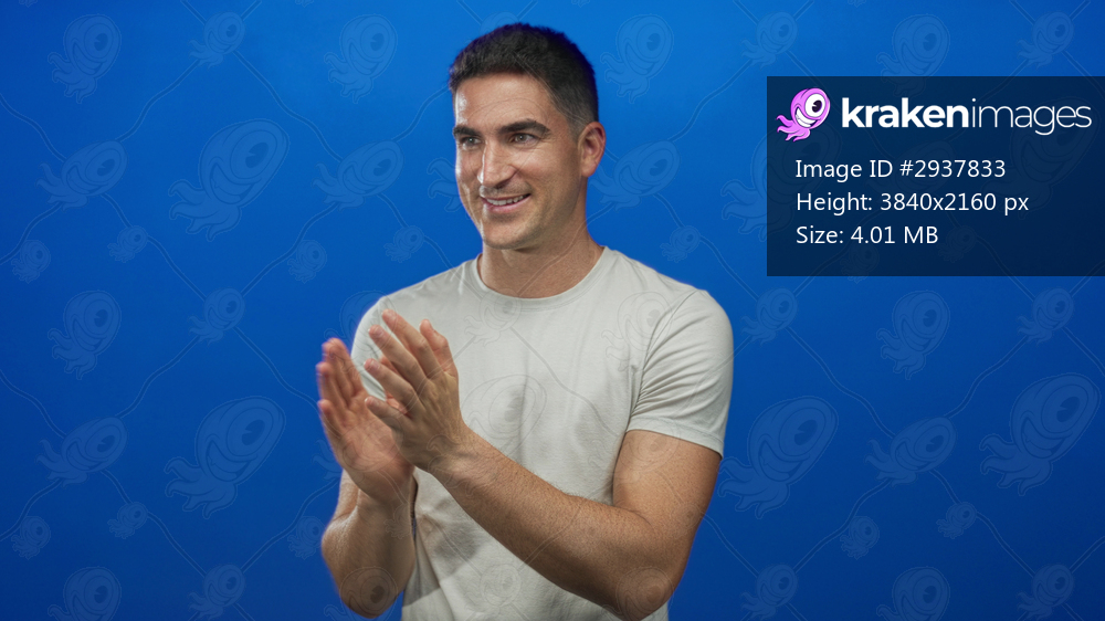 Man clapping hands and smiling in blue studio with white t shirt and casual pose; cheerful appreciation.