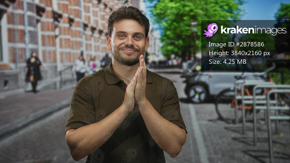 Man clapping hands and smiling on a busy city street with parked cars and bike racks and brick building facades; joy celebration.