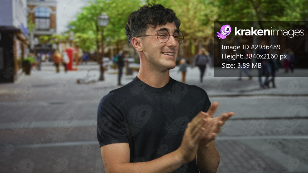 Man clapping hands and smiling on a busy city street wearing glasses and short sleeves, pedestrians and trees behind him; friendly joy.
