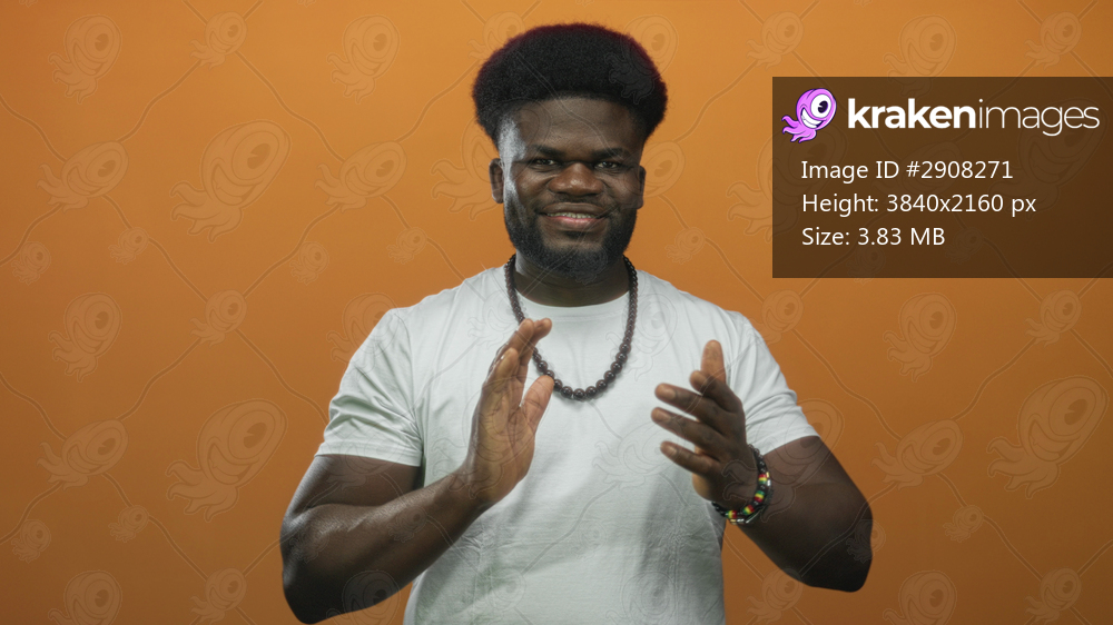 Man clapping hands and smiling, wearing white t shirt and bead necklace against orange studio wall; celebration confidence positivity.