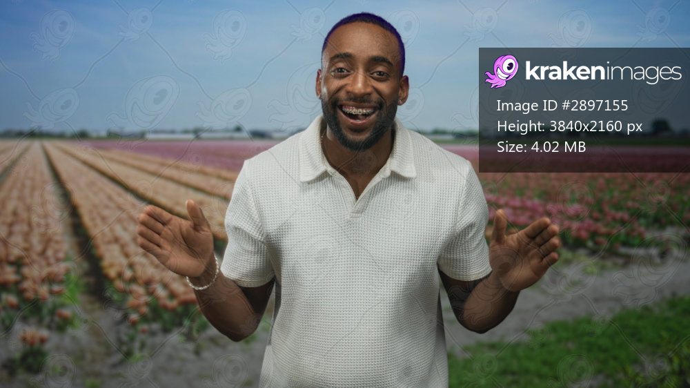 Man clapping hands and smiling while standing among long rows of tulips in a flower field, hands near face in playful cheer; joy gratitude.