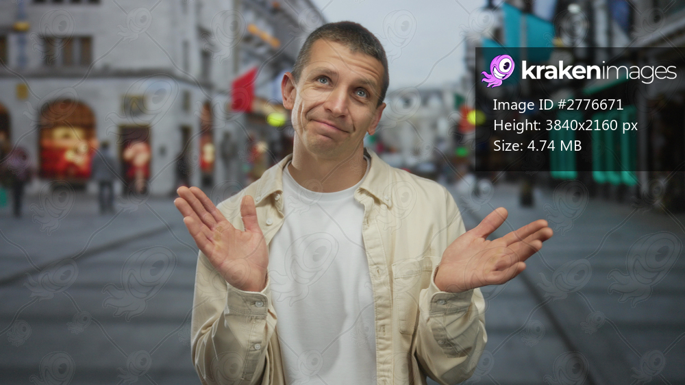 Man clapping outdoors on a lively street with colorful lights and old buildings, creating a cheerful urban atmosphere with motion blur of people and displays in the background. - Kraken Images