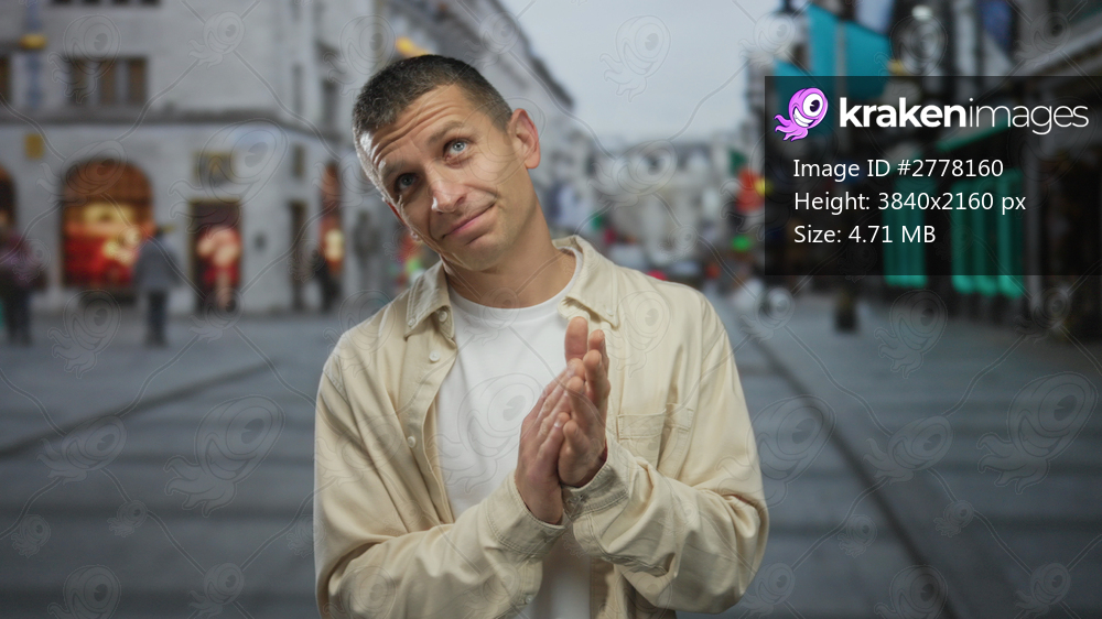 Man clapping outdoors on a lively street with colorful lights and old buildings, creating a cheerful urban atmosphere with motion blur of people and displays in the background. - Kraken Images