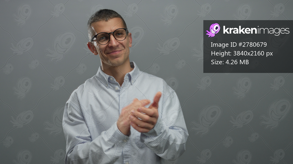 Man clapping wearing glasses and striped shirt against isolated grey wall background expressing approval and positivity in a contemporary setting with a confident smile - Kraken Images