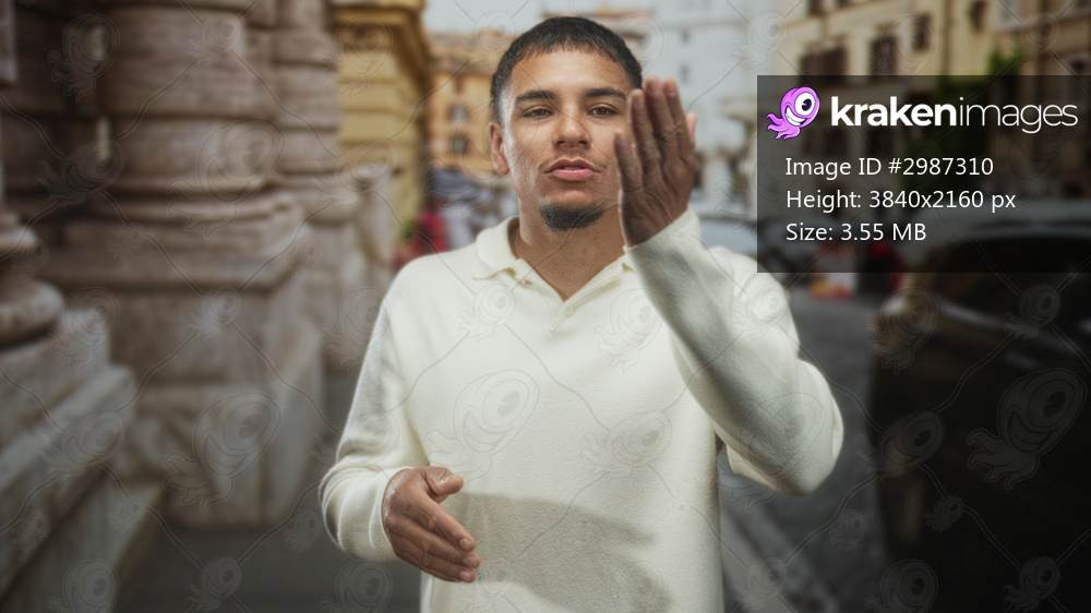 Man claps hands on street beside stone building, wearing cream sweater and goatee; confidence greeting.
