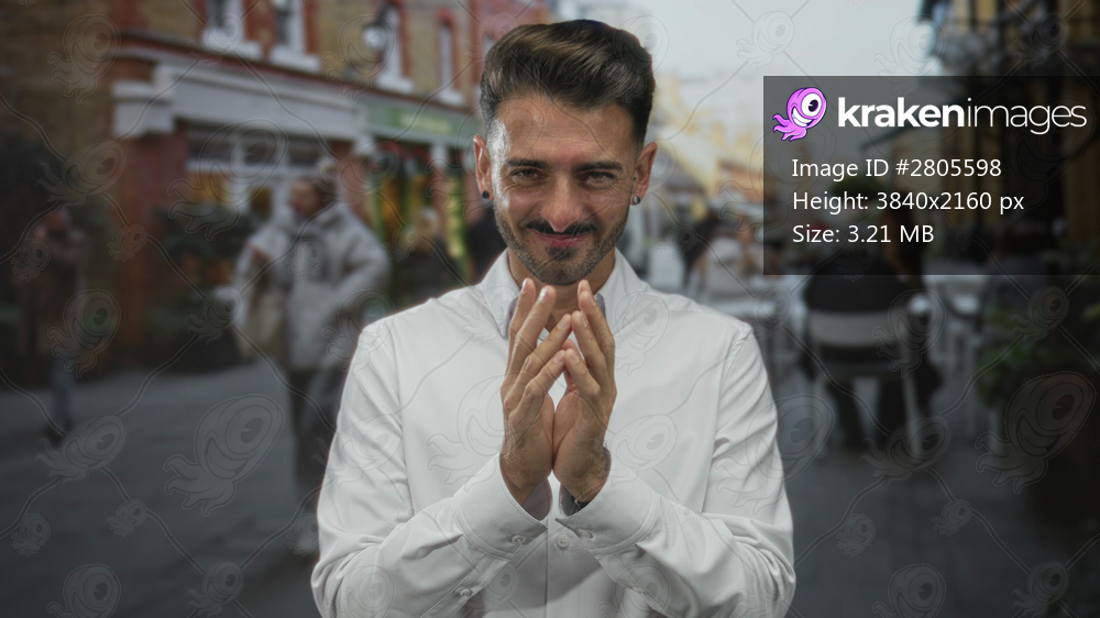 Man claps hands on street outside brick storefront with outdoor tables in bright urban daytime; anticipation.