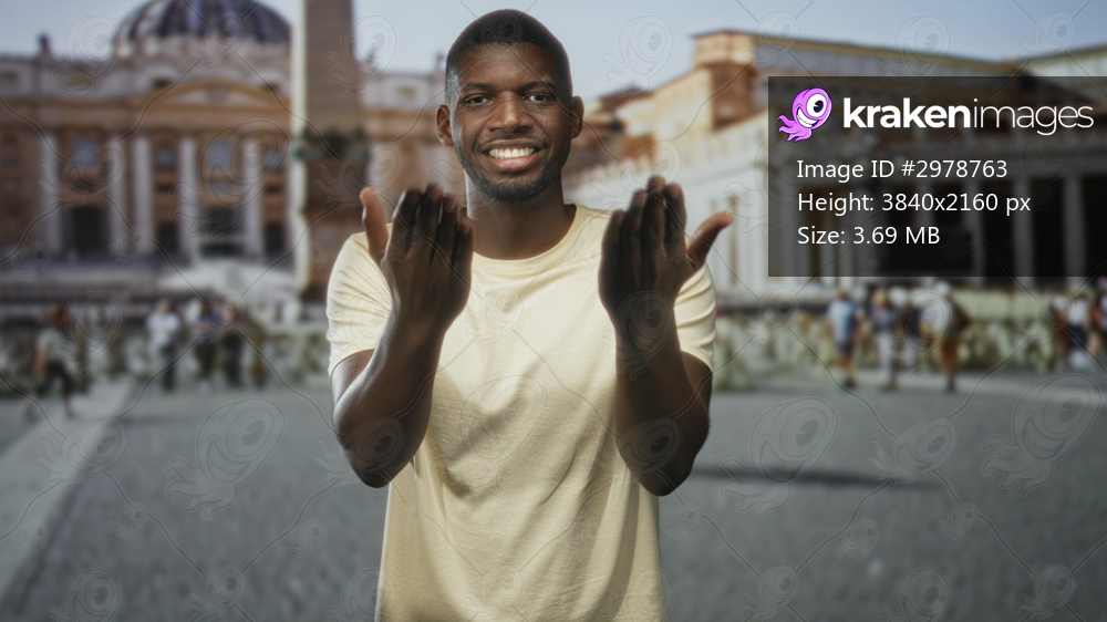 Man claps hands and smiles with palms forward in front of a basilica on street among tourists and colonnades; joy welcome.