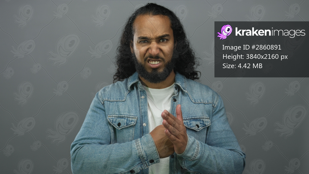 Man claps hands while rubbing palm and fist, wearing denim jacket and white t shirt in gray studio; determination.