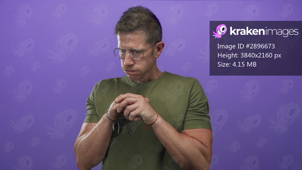 Man with clasped hands at chest, wearing green t shirt and glasses, looking up in purple studio; contemplation.
