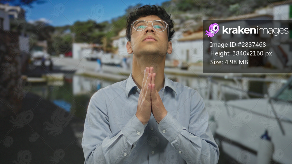 Man with clasped hands, closed eyes, and glasses at port next to white boat under clear sky and bright sunlight; hope.