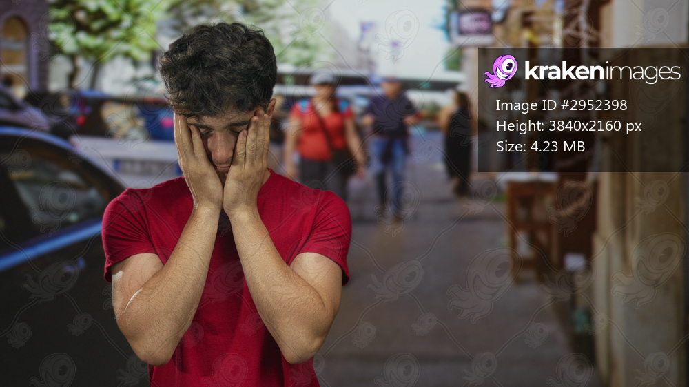 Man with clasped hands and closed eyes in red shirt on city street with blurred pedestrians; quiet hope.