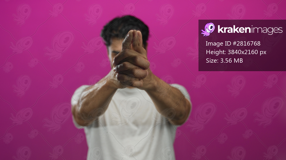 Man with clasped hands and extended fingers pointing like gun while smiling in bright pink studio; playfulness.