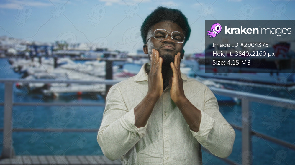 Man with clasped hands and glasses pointing to chest on a street pier by moored boats and metal railing; confidence.