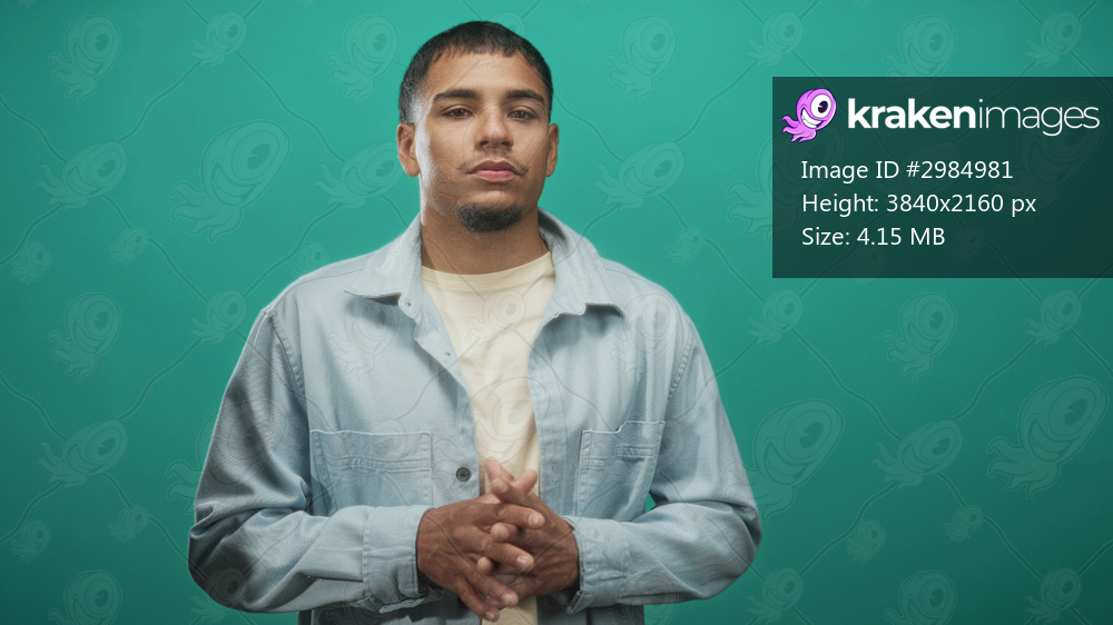 Man with clasped hands looking upward in studio teal backdrop, wearing denim shirt and t shirt with visible goatee and focused gaze; contemplation.