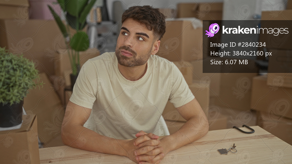 Man with clasped hands looks sideways at a potted plant in a building filled with packing boxes and a ladder; contemplation.