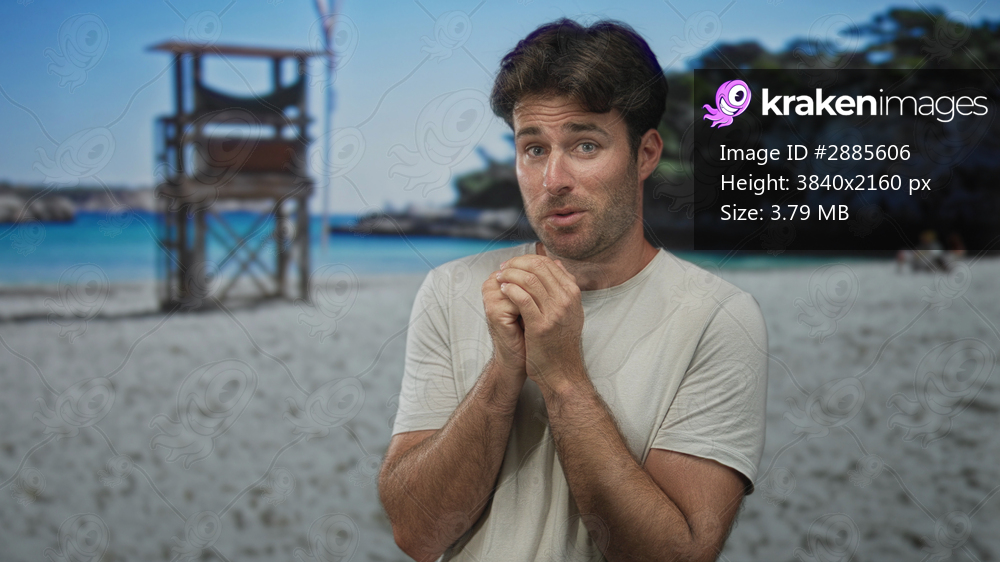 Man with clasped hands near mouth on sandy beach by lifeguard tower pleading expression and hunched shoulders, light tee visible; anxiety pleading.