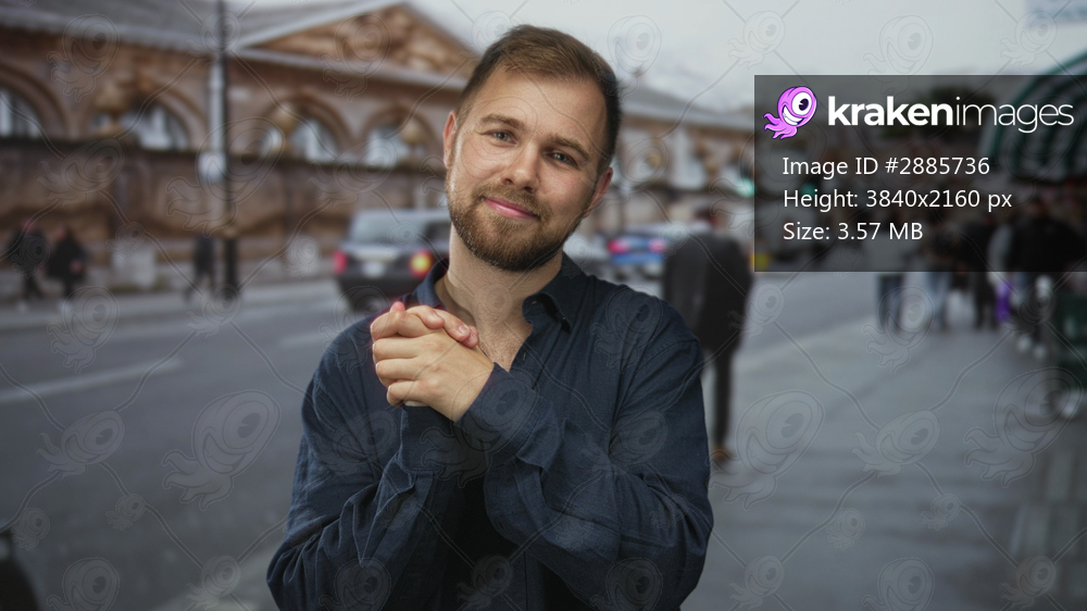 Man with clasped hands on a busy city street, smiling at camera and leaning forward slightly; gentle warmth contentment.
