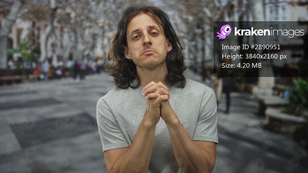 Man with clasped hands and pleading expression on a crowded street with benches and trees, long hair and bare forearms visible; pleading hope.