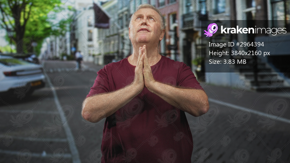 Man with clasped hands praying and looking upward on a city street lined with rowhouses, wearing a maroon tshirt; hope reflection.