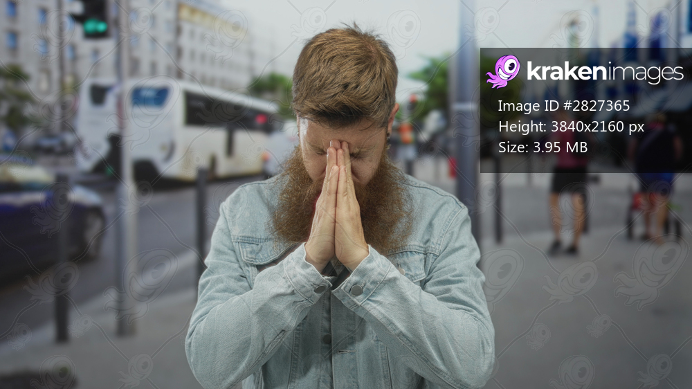 Man with clasped hands praying on busy urban street beside passing vehicles and pedestrians; serenity.