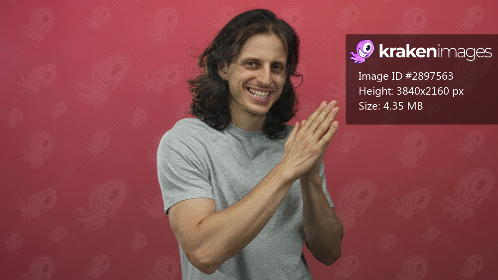Man with clasped hands, smiling with long hair and gray t shirt in a pink studio setting; cheerful confidence.
