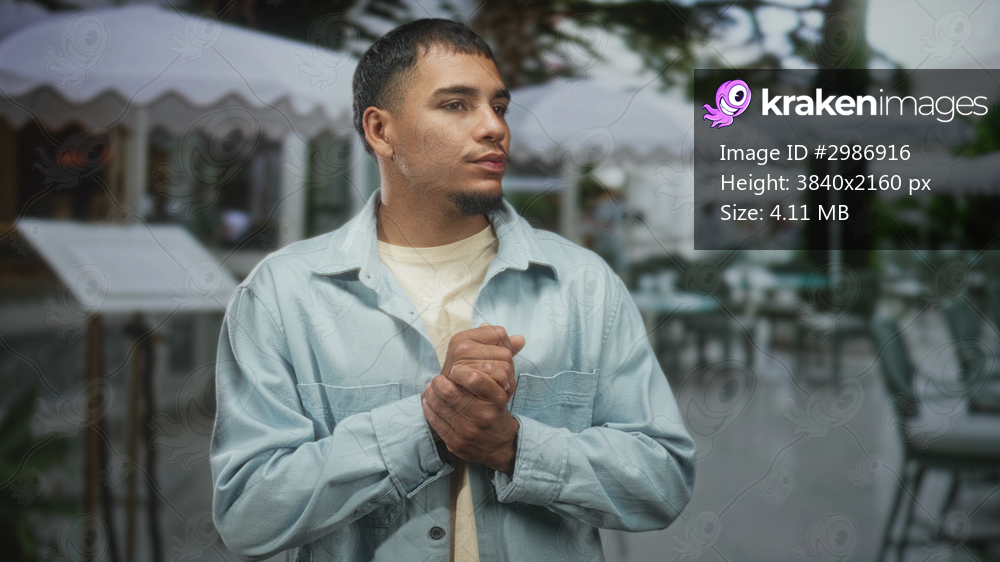 Man with clasped hands standing in a cafe patio by a building, wearing denim jacket and tshirt, gaze forward, slight smile; calm reflection.