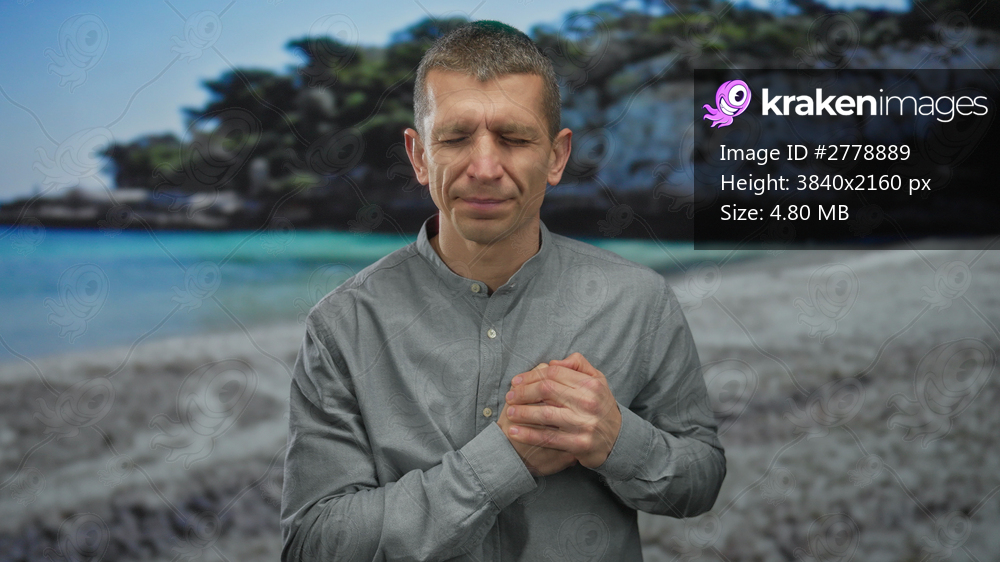 Man with clasped hands stands contemplatively on a scenic beach, ocean waves gently meeting the shore under a clear sky, evoking feelings of tranquility and introspection. - Kraken Images