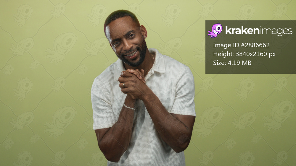 Man with clasped hands and visible forearms in studio with light green backdrop; sincerity connection.